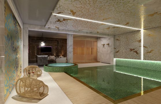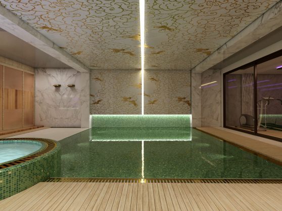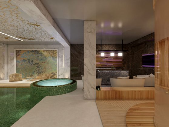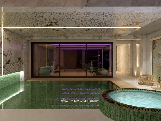 - استخر، جکوزی، سونای خشک، محوطه لانژ در استخر، سالن ورزش